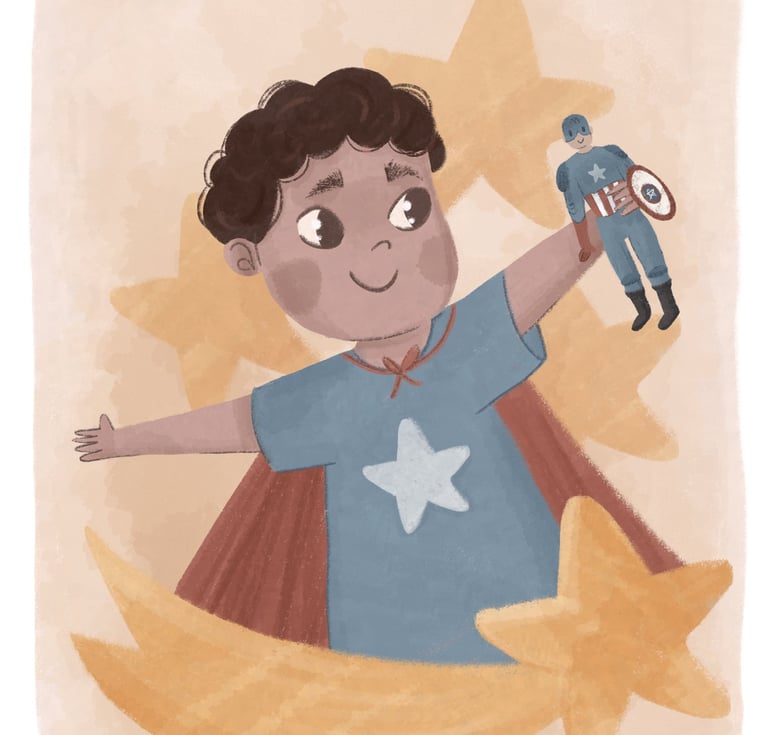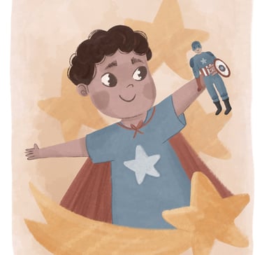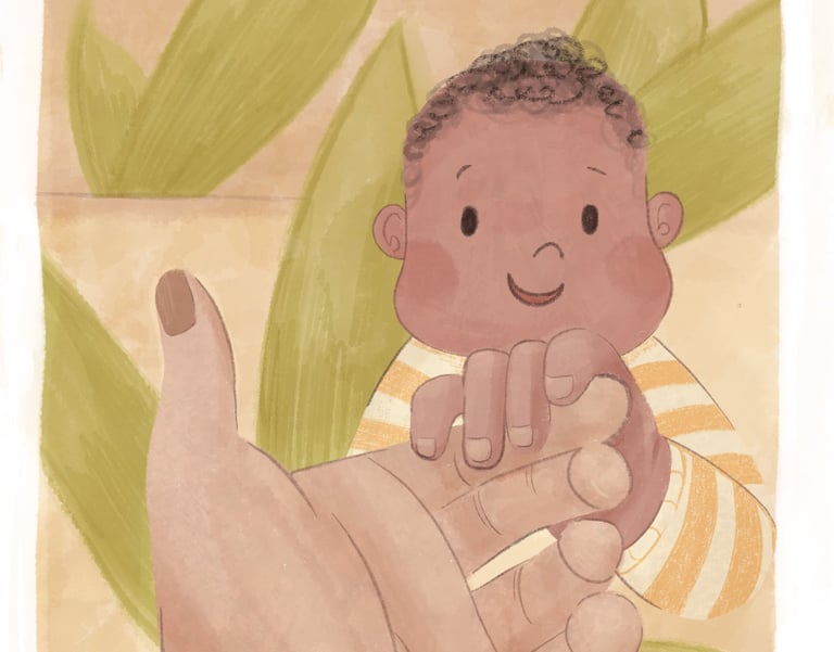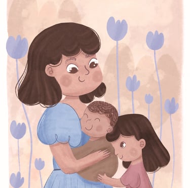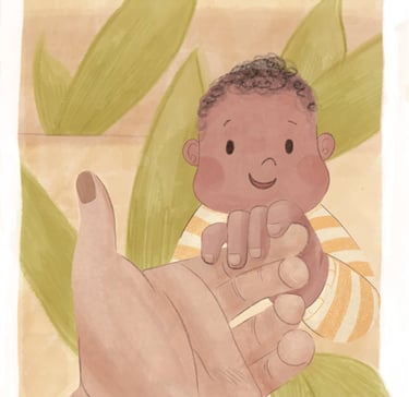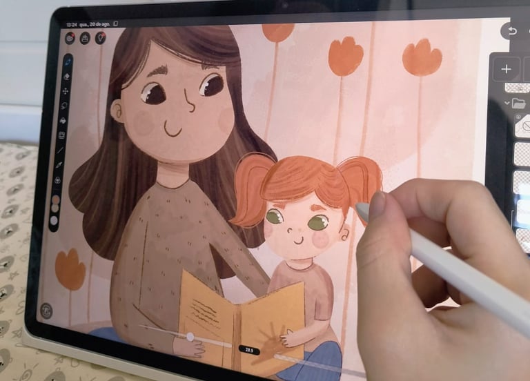 Aqui cada obra é feita manual de forma digital, usando técnicas de aquarela e guache, usando tons que trazem leveza e ternura.