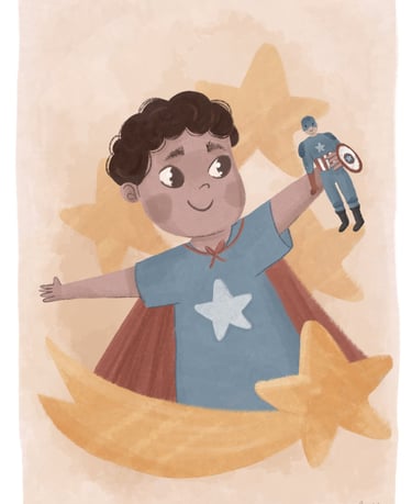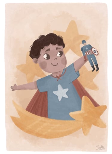A arte realizada inspirada na história presente aqui foi “Mudança de Ciclos”, nesta obra quisemos retratar o crescimento de seu filho João, um menino pré-adolescente e que já passou por diversos ciclos, principalmente a de amar brincar com super-heróis.